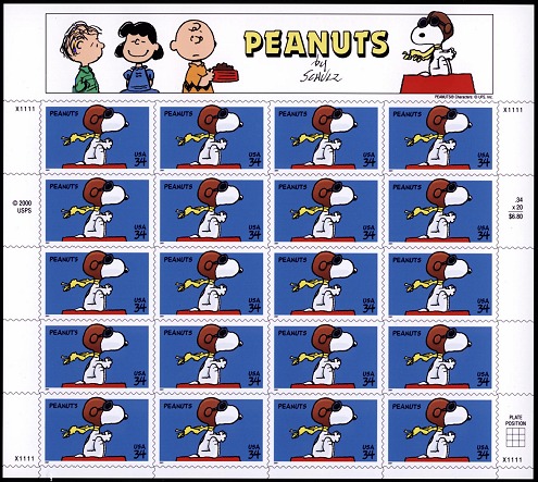 • I just used the list the USPS sent, but the USPS is correct: On May 17, 2001, it issued a single stamp for Peanuts, showing Snoopy flying his doghouse against the Red Baron.