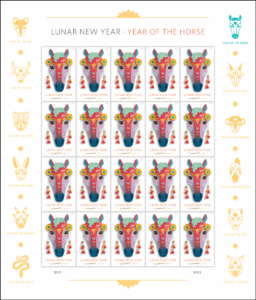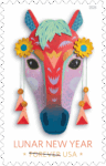 The Year of the Horse stamp features a colorful three-dimensional mask depicting a frontal view of the face of a horse. Antonio Alcalá, an art director for USPS, designed the stamp with original art by Camille Chew. Calling to mind the elaborately decorated masks used in the dragon or lion dances often performed during Lunar New Year parades, Chew’s designs are a contemporary take on the long tradition of paper-cut folk-art crafts created during this auspicious time of year.