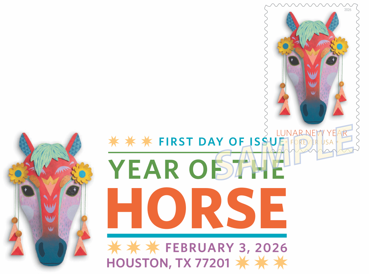 The first-day-of-issue event for the Forever stamp will be in Houston and is free and open to the public. News of the stamp is being shared with the hashtags #LunarNewYearHorse and #LunarNewYearStamp.