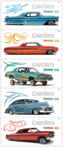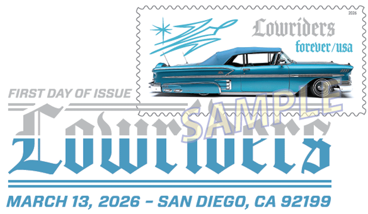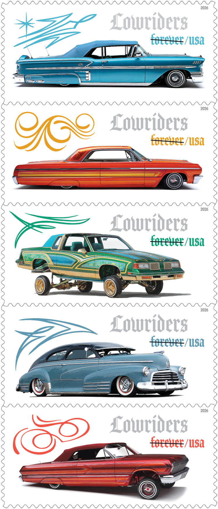On March 13, 2026, in San Diego, CA, the United States Postal Service® will issue the Lowriders stamps (Forever® priced at the First-Class Mail® rate), in five designs, in a
