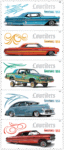 The five models that grace the stamps are pictured from top left: a blue 1958 Chevrolet Impala named “Eight Figures”; an orange 1964 Chevrolet Impala named “The Golden Rose”; a green 1987 Oldsmobile Cutlass Supreme named “Pocket Change”; a blue 1946 Chevrolet Fleetline named “Let the Good Times Roll/Soy Como Soy”; and a red 1963 Chevrolet Impala named “El Rey.”