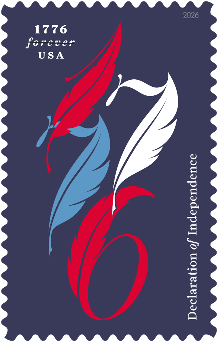 As the nation marks the 250th anniversary of the Declaration of Independence, the Postal Service pays tribute to the document that gave voice to America’s founding ideals. Designed and created by Juan Carlos Pagan, the stamp art features a typographic treatment of “1776,” the year the declaration was adopted. Each numeral takes the shape of a feather quill pen, a nod to the instruments used to sign the nation’s founding document. Pagan worked under the direction of Greg Breeding, an art director for USPS.
