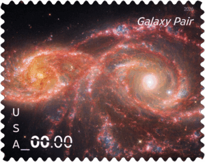 This new Priority Mail Express stamp features another astounding image captured by NASA’s James Webb Space Telescope. The stamp features a composite image from the Webb and Hubble Space Telescopes titled Galaxy Pair. It reveals a view of two interacting galaxies, IC 2163 and NGC 2207, located approximately 80 million light-years from Earth, offering a glimpse into the dynamic processes that shape our universe. Greg Breeding, an art director for USPS, designed the stamp, using a photo courtesy of NASA. Upon favorable review by the Postal Regulatory Commission, the stamp will be denominated at the new Priority Mail Express Flat Rate Envelope rate and an issue date will be announced.