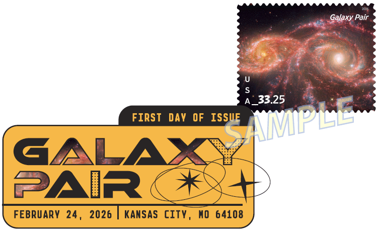On February 24, 2026, in Kansas City, MO, the United States Postal Service® will issue the $33.25 Galaxy Pair Priority Mail Express® stamp, in one design, in a pressure-sensitive adhesive (PSA) pane of four stamps (Item 129600). This stamp will go on sale nationwide February 24, 2026, and must not be sold or canceled before the first-day-of-issue.