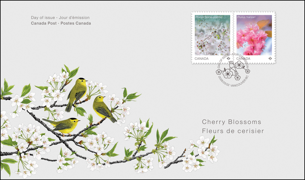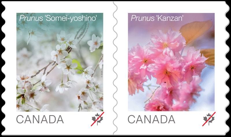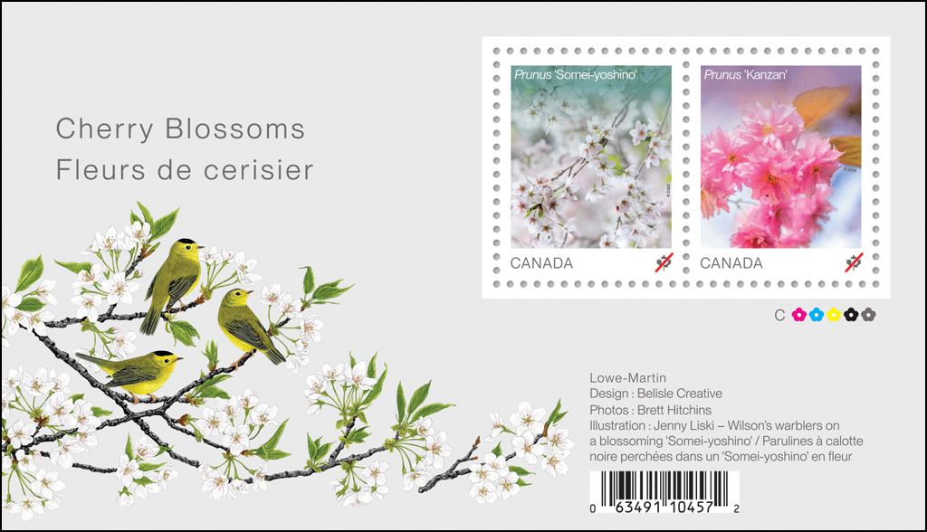 Les deux timbres sont ornés de photos originales de fleurs de cerisier prises au Nitobe Memorial Garden de l’Université de la Colombie-Britannique à Vancouver. Imprimés par Lowe-Martin, ils sont conçus par Belisle Creative et présentent des photographies de Brett Hitchins. L’émission comprend un carnet de 10 timbres PermanentsMC, un rouleau de 50 timbres, un bloc-feuillet et un pli Premier Jour officiel oblitéré à Vancouver.