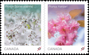 This stamp issue features two cherry blossom cultivars. Prunus ‘Kanzan’, cold-hardy and with large deep-pink double flowers, is one of the most popular Japanese cherry cultivars for blossom viewing in North America and Europe. Shrouded in clusters of white to pale-pink petals, the prolific?Prunus?‘Somei-yoshino’ is