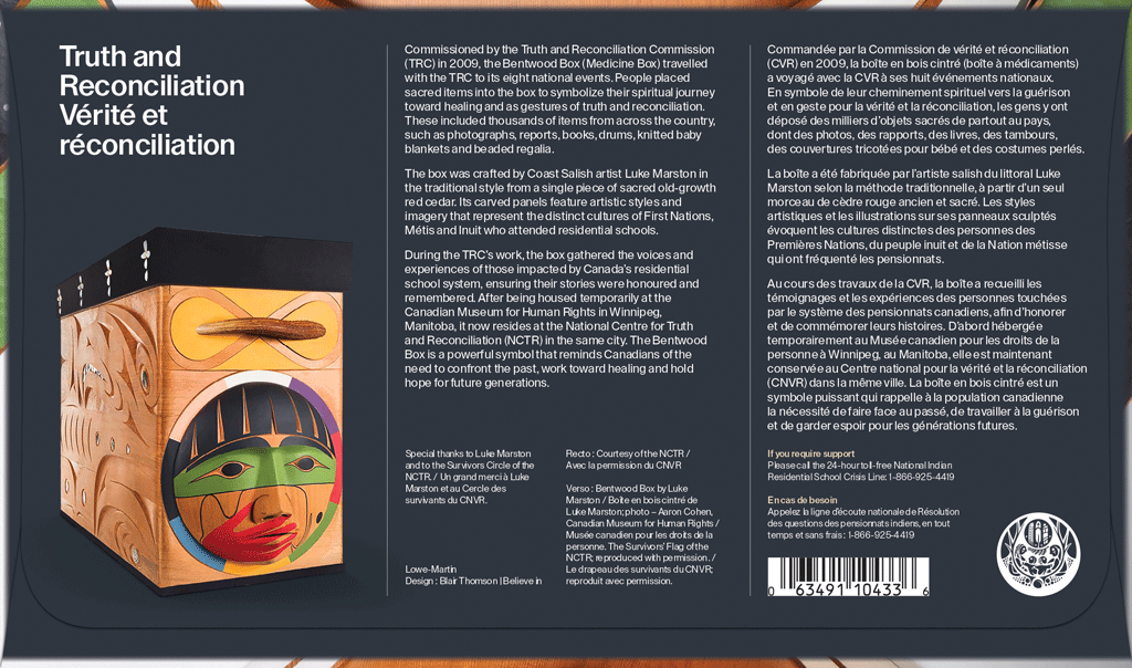 Truth and Reconciliation (NCTR) to create this fourth issue of its Truth and Reconciliation stamp series. Canada Post thanks the Survivors Circle for their guidance and for choosing the Bentwood Box for the series. The partnership helps ensure that the perspectives and voices of Survivors remain central to the stamp creation process.