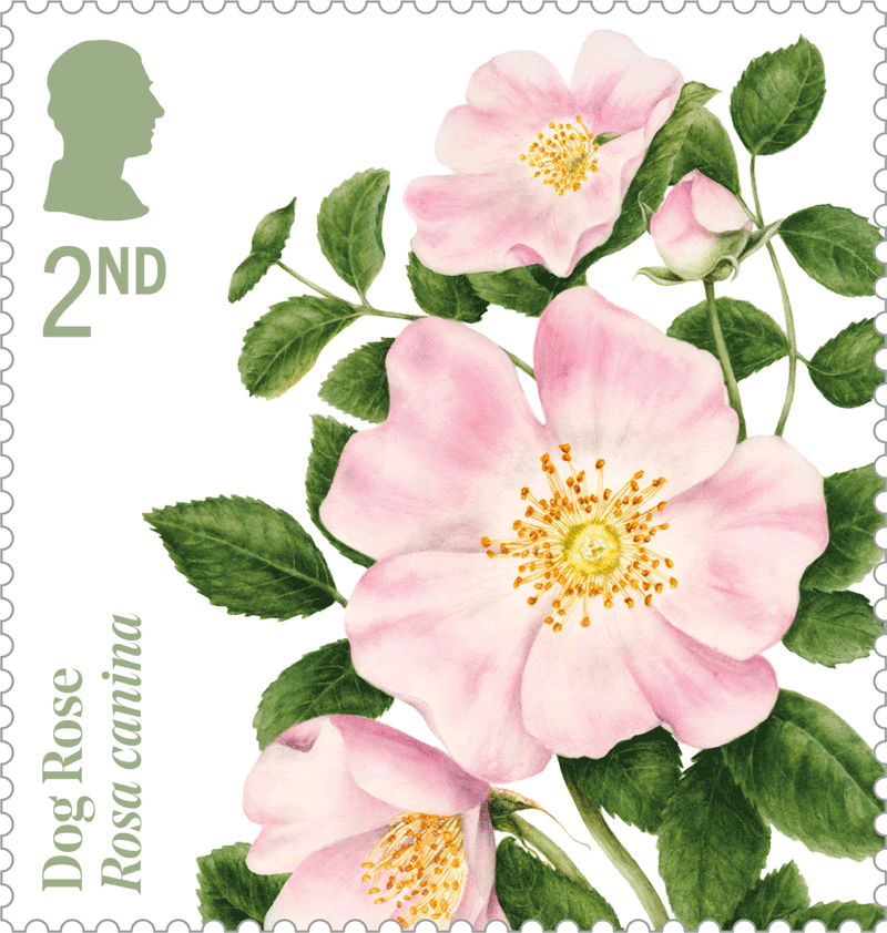 flower, the rose. The vibrant images feature original watercolour illustrations of a variety of wild and garden roses, created exclusively for Royal Mail by acclaimed botanical artist Marie Burke.