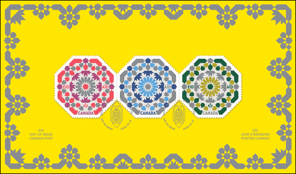 The three-stamp issue incorporates stylized maple leaves into a traditional Islamic pattern to reflect Canada’s cultural diversity and inclusivity. Featuring the same design in different colour palettes, the stamps honour the significance of Eid for Muslim communities across the country.