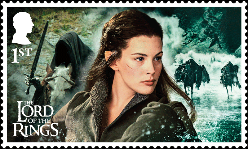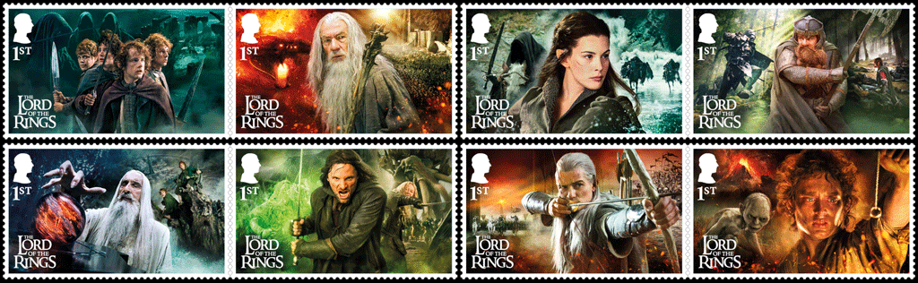 The main set of eight stamps features a montage from the film trilogy celebrating iconic characters from across the franchise. British actors who played the characters featured are Orlando Bloom as Legolas, Ian McKellan as Gandalf, Dominic Monaghan as Merry, Billy Boyd as Pippin and Christopher Lee as Saruman.